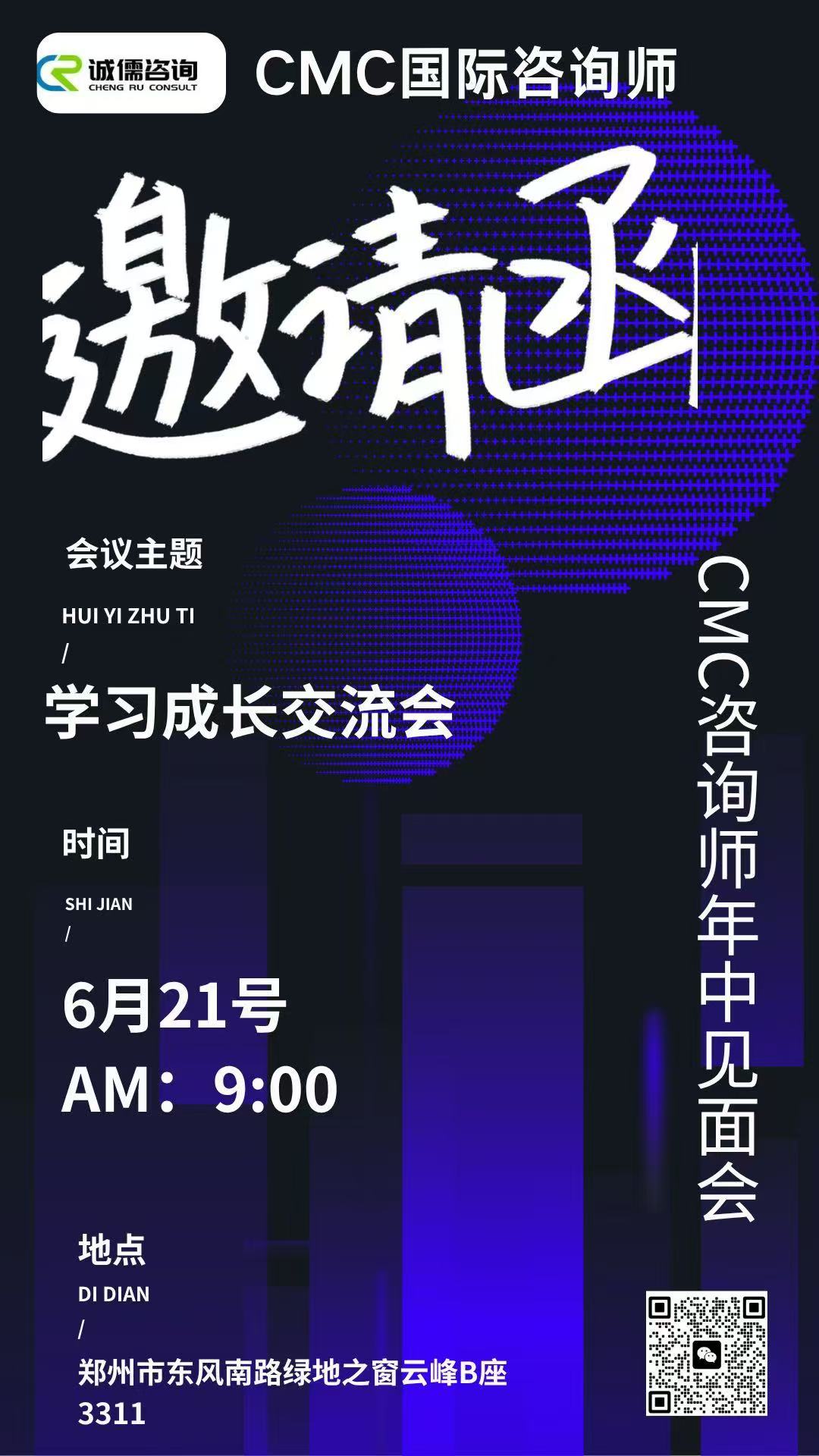 诚儒咨询公司定于6月21日,在郑州召开CMC咨询师线下交流会,咨询师的年中见面会,为咨询师、总经理提供一个学习交流的机会。